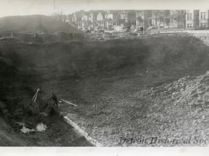 Photograph. Black and white photo of the Davison Freeway construction project. The view shows the nearly completed Woodward Avenue bridge over the Davison Freeway. Two pedestrians and several cars and trucks can be seen in the background. Buildings and businesses in the background include the Wayne Oakland Bank, Grand Theater, and the Murphy Building. Handwritten text on the photo album page shows "7-28-42, First Car Across Woodward Ave. at 10:15 A.M."