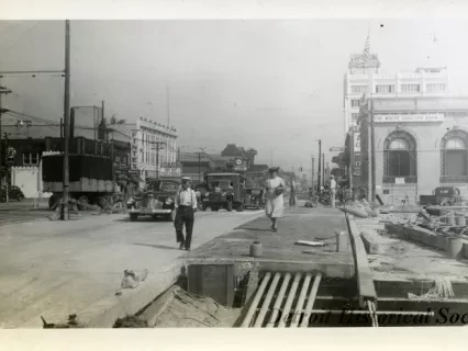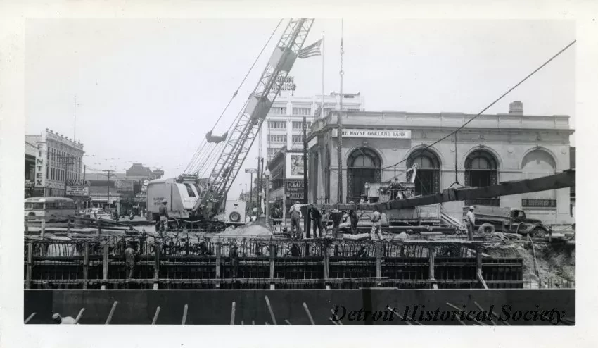 Photograph. Black and white photo of the Davison Freeway construction project. The view shows a group of workmen who are pouring concrete for a bridge abutment at Woodward Avenue. A crane can be seen in the background along with the Wayne Oakland Bank, Murphy Building, and the Grand Theater. Handwritten text on the photo album page shows "6-16-42, Pouring North Abut., Woodward Ave."