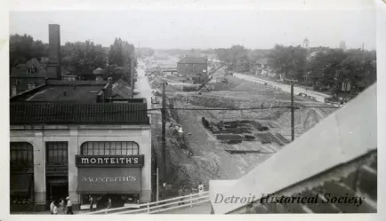 Photograph. Black and white photo of the Davison Freeway construction project. The elevated view is taken from the roof of Benson's Cut-Rate Furniture Store and looks across Woodward Avenue to Sanders Bakery and Monteith's millinery store. The freeway construction project site can be seen in the right background area of the photo. Handwritten text on the photo album page shows "7-17-42, View From Top of Furniture Store, Looking West From Woodward Ave."