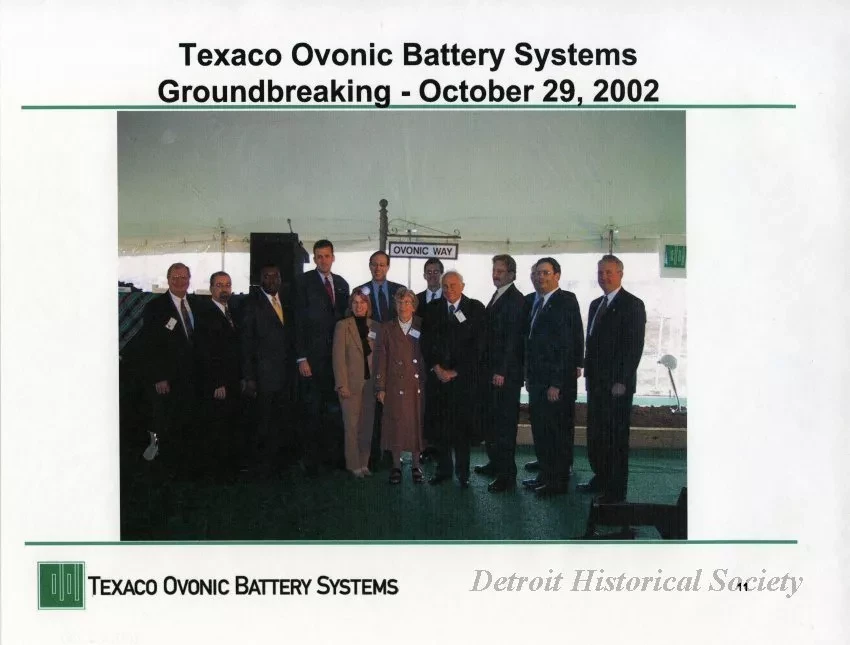 One digital print of a color photograph of Stanford R. Ovshinsky, founder of Energy Conversion Devices, Inc. (ECD), and his wife, Iris, who are attending a groundbreaking ceremony. The attendees are all well-dressed in business attire and are standing beneath a large white tent. A podium can be seen in the left background and a sign post can be seen in the center background. A sign on the post has text that reads "Ovonics Way." Black printed text above the image reads "Texaco Ovonic Battery Systems Groundbreaking - October 29, 2002." A logo is shown near the lower left corner with black printed text that reads "Texaco Ovonic Battery Systems." Stanford Ovshinsky is standing near the center of the photo (4th from right) and his wife is standing beside him (5th from right). The other persons are not identified.