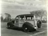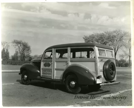 Black and white photographic print depicting a Department of Street Railways Chartered Coach Division woodie parked on the side of a road.