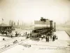 Sepia-toned photograph depicting a completed Eagle Boat hull being positioned on the launch elevator at the Ford River Rouge Factory Complex, as taken from off of its port bow. Workers and spectators are observing the process. The Launch Control Building stands on the left side of the photo. After launching, the boat will be moved to the outfitting station, also located on the Rouge River. The caption, "Ship in position on elevator," is on the verso. Lower right hand corner of photo has number and date of photo: 22857-8-19-18. Photo mounted on a linen backing.