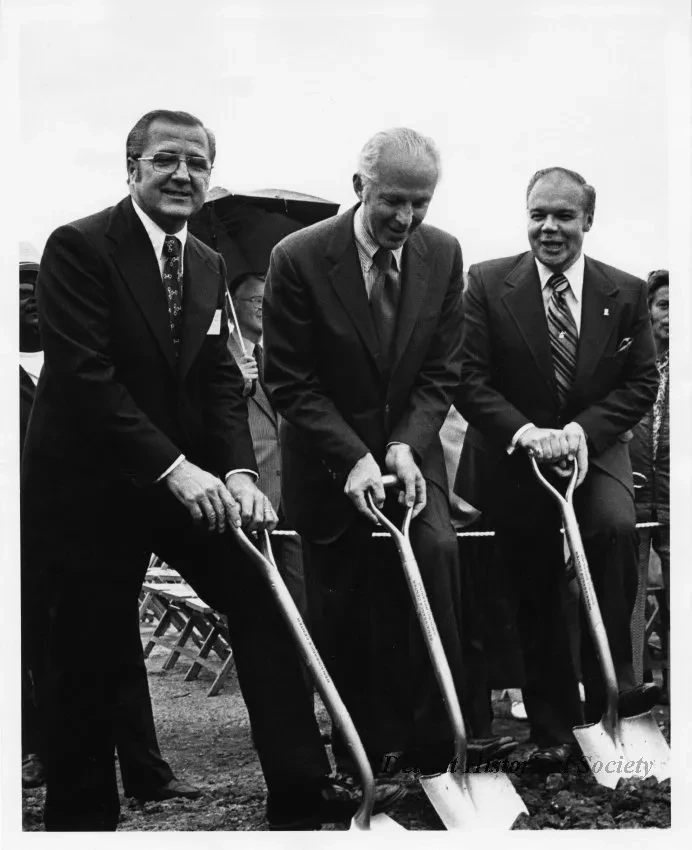 Black and white photograph of Mayor Roman Gribbs (left) and two others, all in suits, with feet and hands on shovels in a ceremonial groundbreaking pose, taken May 22, 1973 at the groundbreaking of the Renaissance Center. A stamp on back of the photograph reads: "CITY OF DETROIT, REPORT & INFORMATION, 72153-24, PHOTOGRAPHIC"