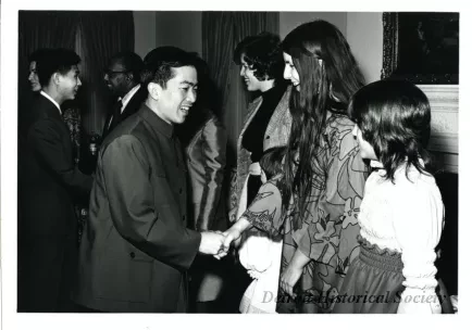 Black and white photograph one of the Chinese ping pong players is shaking hands with one of Gribbs' daughters, who are all lined up, at the dinner at the Manoogian Mansion in which they played host to the Chinese Ping Pong players and six members of the Chinese delegation from the United Nations in April of 1972. "City of Detroit Report & Information, 72075-13, Photographic," is stamped on the verso.