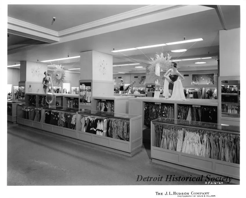 Print. Black and white photographic print of an interior women's department at the J.L. Hudson Company Department Store. The latest in ladies swim wear is featured including racks of swim suits in various styles, colors, and patterns. Two female mannequins are featured atop the display and are dressed in the latest swim wear fashions. Ladies sportswear is featured in the background. The photographic sequence number, company name, and photographer's name are featured on the bottom of the recto, "25216-6x; The J.L. Hudson Company; Photography by Davis B. Hillmer."