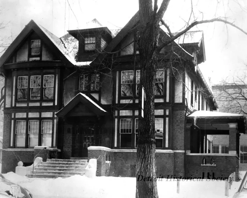 Request ImageBlack and white photographic print of the Detroit Historical Museum, covered in snow, located at 441 Merrick, in the former Homer Williams home.