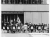 Black and white photographic print of the dedication ceremonies of the Anthony Wayne plaque, held in the outdoor plaza of the Pontchartrain Hotel, May 1967. Detroit Historical Museum Director, Mr. Henry D. Brown stands behind the podium and is giving a speech prior to the presentation. Patrons are seated in chairs before Mr. Brown, and a military honor guard accompanies the ceremonies. A military reenactor stands adjacent to the plaque affixed to the wall of the hotel. Handwritten on the verso, "Henry D. Brown, Speaker."