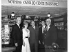 Black and white photographic print of Mr. Stanley S. Kresge (center), and from left to right Mr. H. Richard Steding III; Ms. Diane Dreher; Kresge; Mr. Henry D. Brown, Director of the Detroit Historical Museum; and Mr. Gordon O. Rice; stand in Kresge and Wilson 5¢ & 10¢Store, reproduced in the Streets of Old Detroit exhibit, located inside the Detroit Historical Museum.