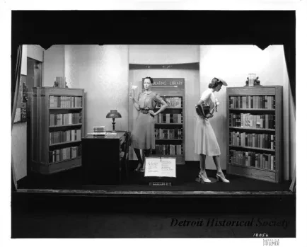 Print. Black and white photographic print of a window display at the J.L. Hudson Company Department Store. Two female mannequins are displayed reading and browsing for books displayed in cabinets. Signage above one of the book displays reads, "Circulating Library," and also features an arrow pointing toward the left. Signage in the foreground reads, "Put Yourself on a Reading Diet... a snack of mystery, a dash of adventure, well-seasoned with romance, all so easily digested and quite nourishing too. A full course of fiction and non-fiction... HUDSON's Circulating Library, the latest and the best. Mezzanine, Bridge." The photographic sequence number, and photographer's name are printed on the bottom of the recto, "18056; Davis B. Hillmer."