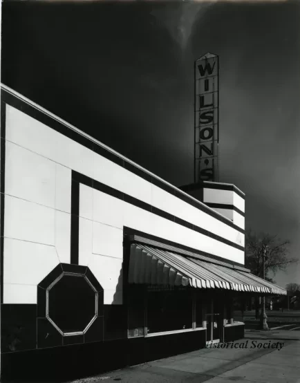 Black and white photograph of the Ira Wilson & Sons Dairy Co., on the northeast corner of the James Couzens Service Drive and W Outer Drive. The photograph depicts the front entrance of the building with a view to the southeast. The building is topped by a vertical "Wilson's" sign.
