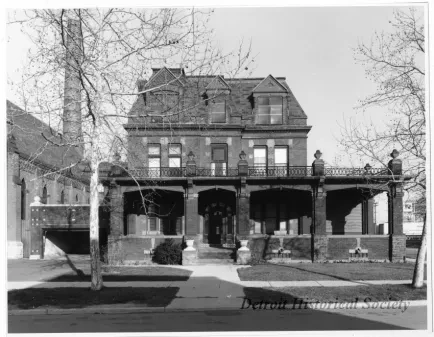 Black and white oversized photographic print mounted on board depicting a house at the northeast corner of Ste. Anne Street and W. Lafayette Boulevard that adjoins Ste. Anne de Detroit Catholic Church. A brick smokestack rises above the roofline of the church. A sign visible in the background reads "Ryder" and a large truck is parked beneath it with the same name on the side.