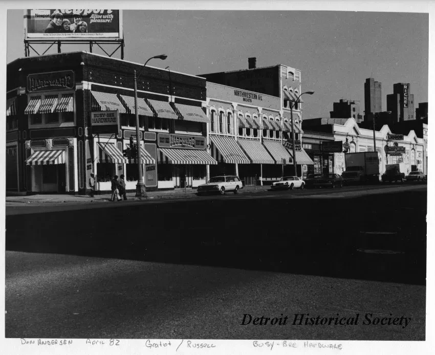 Black and white photographic print mounted on board depicting the north corner of Gratiot Avenue from the intersection of Russell Street, with pedestrians and parked vehicle. Businesses include Busy-Bee Hardware, Northwestern K & L Meats, Als' Salvage Groceries and Gratiot Central Market. Billboard on top of Busy-Bee Hardware reads "Newport, Alive with pleasure!" Rickel Malt building visible in the background. Signs read "Free Delivery", "Locksmith", "Linoleum", and "Liquor". Dated April, 1982.