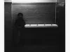 Black and white photographic print mounted on board depicting an African American boy named Derrick Jackson leaning against a water fountain located inside Davison Elementary School.