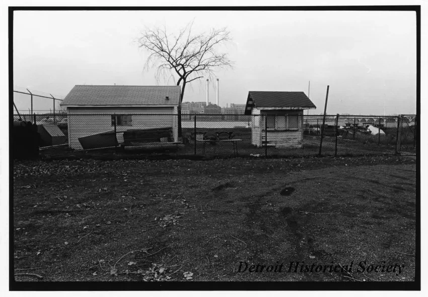 Black and white photographic print on board depicting two small clapboard-sided buildings on Belle Isle behind a chain link fence. The Detroit River, Uniroyal Tire Company and MacArthur Bridge are visible in the background.