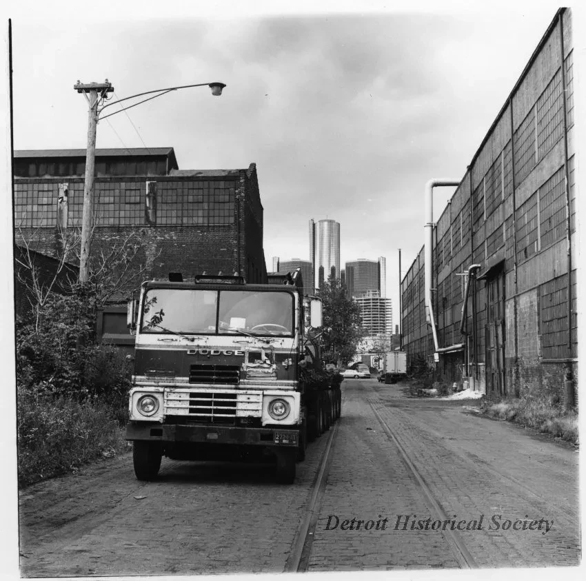 Black and white photographic print mounted on board depicting a flatbed Dodge Commando parked on Guoin Street, facing west with the Globe Trading Company Building to the left. Detroit Manufacturers Railway tracks are visible in the brick paving. The Renaissance Center is visible in the background. Tower 600 of the River East Center is under construction. Dated October 1980.