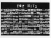 Black and white photographic print mounted on board (and one copy not on board) depicting the "Top Hits" section of Harmony House, displaying 7-inch 45 RMP record singles. The sign hanging above the shelves reads "Top Hits".