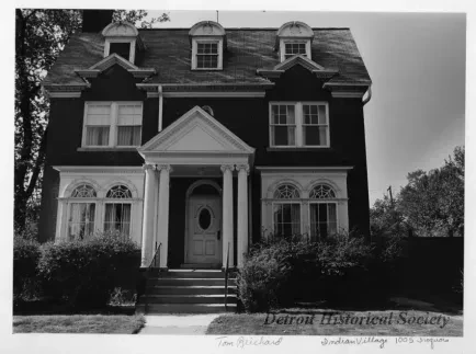 Black and white photographic print, mounted on board, of a house on the west side of Iroquois Street at E Lafayette Street. The two and a half story Georgian Revival style home features a gabled porch with Ionic columns; ornamented windows, and three dormers.