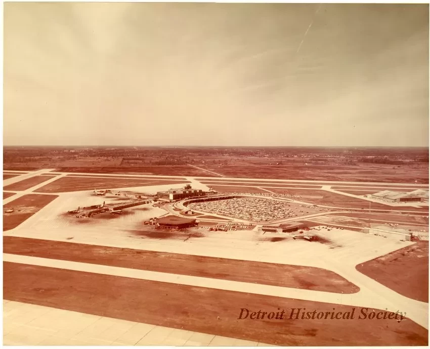 Mounted on board. A caption affixed to the board reads "Metropolitan Airport Center Detroit News Photo By M.D. Stroecker Type C Print by Grossman Knowling Co."