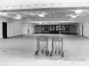 Black and white photographic print mounted on board depicting the interior of Michigan Central Station. Four empty luggage carts sit in the middle of the hall and a sign points forward and reads "To Station".