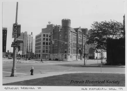 Black and white photographic print mounted on board depicting the G.A.R. Building, looking east from the intersection of 1st Street and Grand River Avenue. The Michigan Building, 1922 Cass Avenue, and The Parks Apartments can be seen in the background. A street sign to the left reads, "Edison Center." A sign on a rooftop reads "AAA".