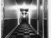 Black and white photographic print depicting a hallway in the Pick-Fort Shelby Hotel. Room doors are visible on either side of the hall. A sign in the background reads "Elevators".