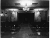 Black and white photographic print depicting an auditorium at the Pick-Fort Shelby Hotel, taken from the back of the room. Chairs fill both sides of the room. A stage is visible at the front of the room. A sign over a door on the right side of the photo reads, "John F. Nichols for Mayor."