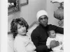 Black and white photographic print mounted on board depicting an African American man, woman and baby sitting on a coach in a living room. A lamp can be seen in the right of the background and a picture and a framed shelf hang on the wall behind the couch.