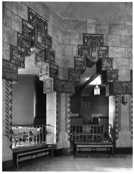 Black and white oversized photographic print depicting the interior of the Vanity Ballroom at 14201 E. Jefferson Avenue. Two benches sit at the edge of the dance floor framed by arched windows decorated in Art Deco style. A circular dining table covered with a white tablecloth is visible in the background. Dated May 1975.