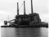 Black and white photographic print depicting the Detroit Edison River Rouge electric power plant with three large smokestacks. The Rouge River can be seen in the foreground.