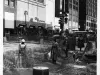 Black and white photographic print, mounted on board, of the intersection of Woodward Avenue and Clifford Street under construction. Three women are walking across the make-shift sidewalk; the first woman has stopped to view the actions of the construction worker. Retailers visible in the background include Marianne; Pepper's; Wigs; and Meyer's Treasure Chest Shoes. Dated 1979.