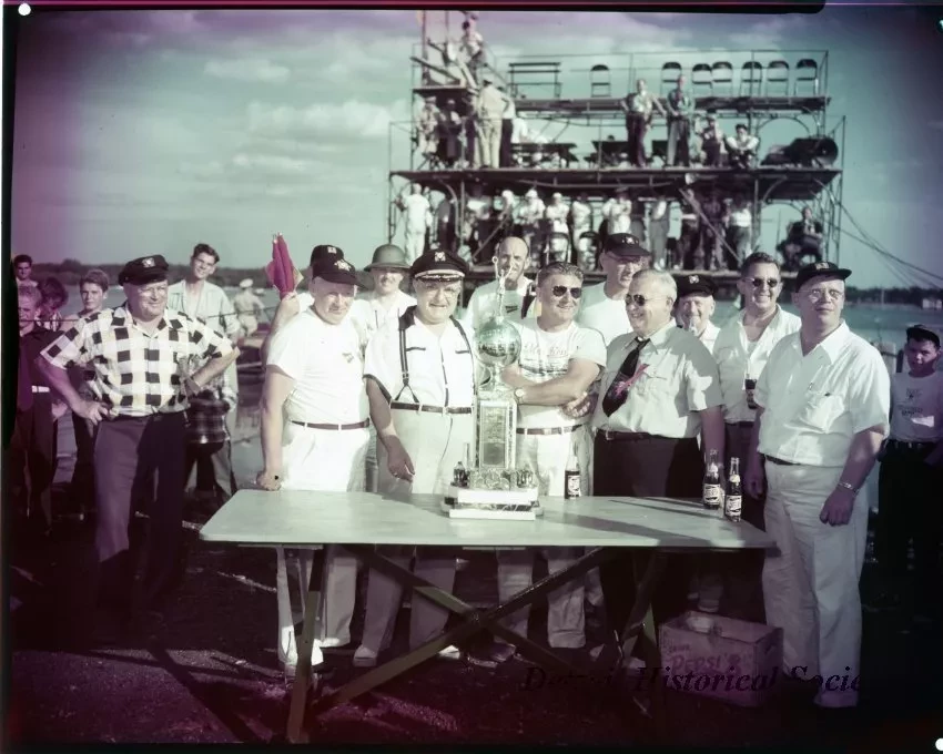 Color film positive of Chuck Thompson--clad in a MISS PEPSI t-shirt-standing beside Walter Dossin on his right, and Roy Dossin on his left, and surrounded by several other unidentified men. The group stands behind a table holding the Henry Ford Memorial Trophy. Three bottles of Pepsi are on the table, and the man wearing sunglasses on the right holds a fourth. An empty Pepsi crate is on the ground beneath the table. Onlookers are gathered around them, and a multi-tired observation stand is on the riverfront in the background.