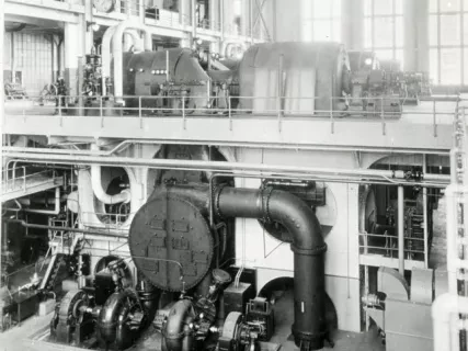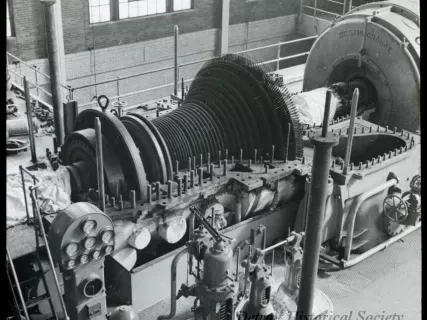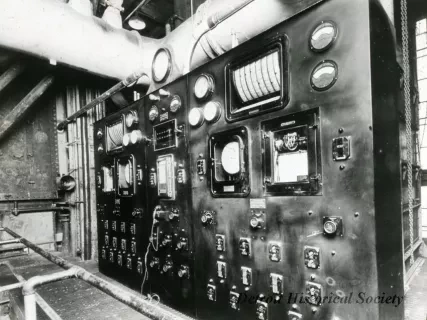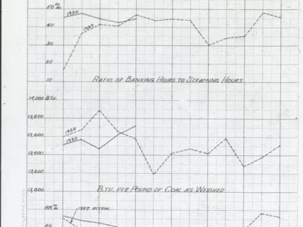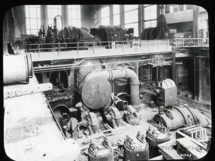 Glass Lantern-Slide. Bears a photo of the coal storage area outside of the Mistersky power station. A truck is stopped at the foot of a large pile of coal. Some equipment is in front of an adjacent pile. The Detroit River is in the background. The edge of the slide is covered in black tape.