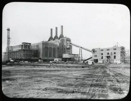 Glass Lantern-Slide. Bears a photo of the exterior of Mistersky power station, as viewed from the southwest. Scaffolding surrounds the switch house. The breaker house is also under construction--no windows have been installed, and scaffolding covers the rear wall. "79655" is printed in the lower right corner. "Manning Bros. Detroit" and "Slides For All Purposes are printed" on the opaque sides of the recto. "3" is handwritten on a sticker affixed to the recto. The edge of the slide is covered in black tape.