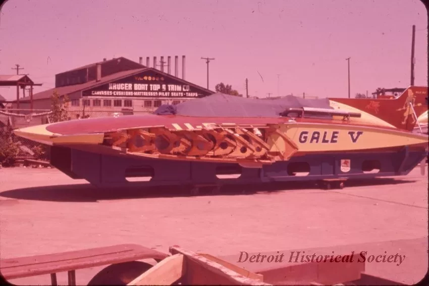 The building in the background with the Kruger Boat Top and Trim sign was located at Kean's Marina. The "seven sisters", smokestacks at the Detroit Edison plant, can also be seen in the far background. This GALE V, the third boat to carry the name, was owned by Joe Schoenith of Detroit and raced from 1958 to 1964.