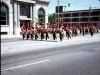 Color slide of a marching band clad in red, black, and white performing in a parade along Woodward Avenue in Highland Park, taken from the front of Sam's Party Store on the east side of the street at 13523 Woodward. The Wayne Oakland Bank at 15304 Woodward Avenue stands across the street in the background. "MAY 71" is stamped on the slide's housing.