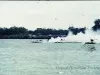 Color slide of three hydroplanes, rounding the upper turn, from the 1990 Gold Cup Race. Pictured, from right to left, are MISS BUDWEISER, driven by Tom D'Eath, MISS CIRCUS CIRCUS, driven by Chip Hanauer, and OH BOY! OBERTO, driven by Mark Tate. The Belle Isle shoreline and spectator crowd can be seen in the background.