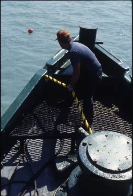 Color slide of a man hoisting a rope on the port side of the bow of a tug boat, as taken from above the boat's cabin. A small buoy floats in the water ahead of the boat. "July 84" is stamped on the slide's frame. This photo was presumably taken during the 1984 recovery effort of two British cannons from the Detroit River performed with the Gaelic Tugboat Company.