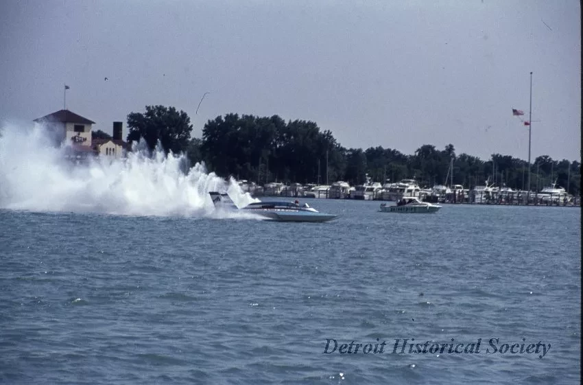 Color slide, taken during the 1978 Spirit of Detroit Race, of ATLAS VAN LINES, driven by Bill Muncey, with the Detroit Yacht Club in the background. The boat finished first overall in the race.