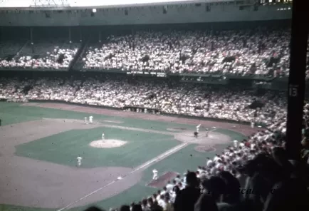 One 35 mm "Kodachrome" color slide that shows an image of a baseball game underway in Briggs Stadium. The elevated view looks across the left field stands (section 13) in the lower right foreground and shows the baseball diamond and players in center background. The right field stands are visible in the far background. Handwritten blue pen text on the slide frame reads "Tiger Stadium, Detroit, 1955," and "Fred Ritsema, 1654 Dickinson, Grand Rapids."