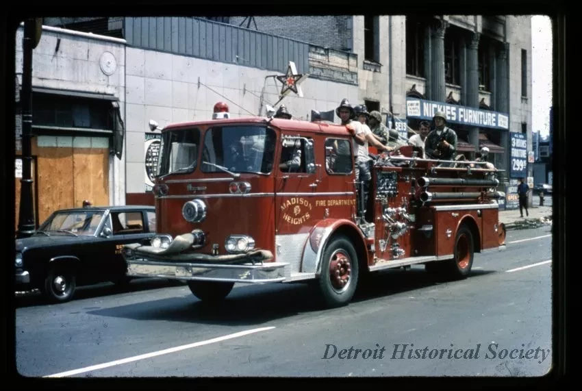 Color 35mm slide of a photo taken during the unrest of 1967 by Detroit Fire Department photographer Capt. Joseph A. Mancinelli. The image shows a Madison Heights Fire Department firetruck on Grand River Avenue. Several firefighters in t-shirts and helmets ride on the rear of the truck along with members of the Michigan National Guard. Nickies Furniture stands in the background, its exterior blackened from fire.