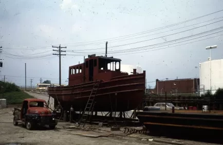 One color slide of the new tugboat, HAMP THOMAS, which is under construction at the Hans Hansen Welding Company yard in Toledo, Ohio. The slide shows a starboard side bow view of the unpainted vessel which is resting in a cradle. A truck is parked near the vessel in the left foreground and the end of a small barge is visible at the right. Large steel fuel tanks and overhead utility lines are visible in the background.