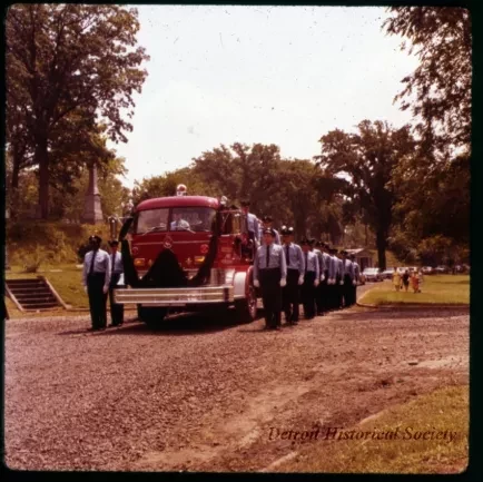 Color 127 format slide of a photo taken during the unrest of 1967 by Detroit Fire Department photographer Capt. Joseph A. Mancinelli. The image shows a Detroit Fire Department fire truck, draped with a black cloth, and carrying the flag-draped casket of firefighter Carl Smith through Elmwood Cemetery. A group of fire fighters in dress uniforms stand beside the truck. A row of cars, and the Traugott Schmidt Mausoleum are visible in the background.