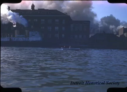 Color photographic slide depicting the Parke, Davis and Company Research Laboratory and the old firehouse for Engine Company No. 25 as viewed from the Detroit River to the south. Two people in a motorboat, and the City of Detroit Fire tug, JOHN KENDALL are in the foreground. Large clouds of smoke rise behind the laboratory. The slide is encased in a cardboard frame with "Kodachrome," printed above and below in red. The number 1 is embossed on the verso of the slide.