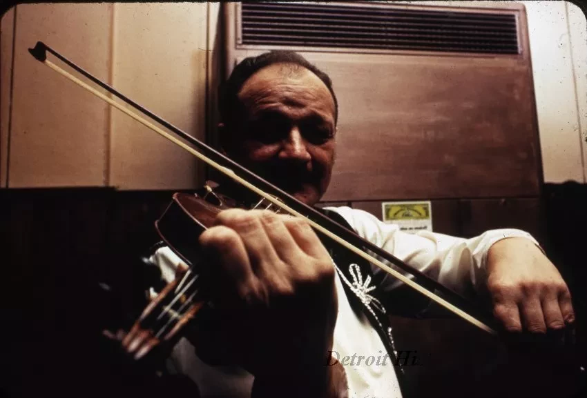Request ImageColor photographic slide depicting a musician clad in a folk costume playing a violin in Kovacs Bar, with an air conditioner in the background.